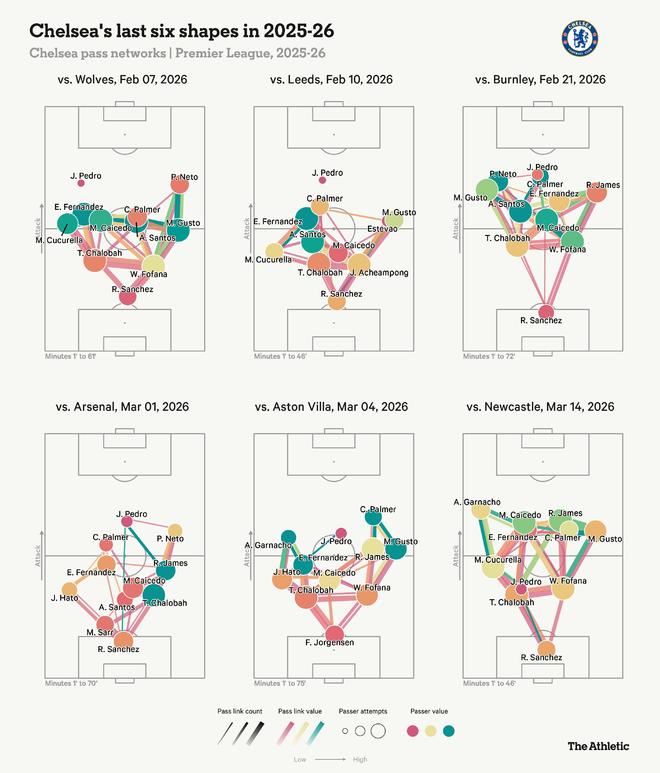 波切蒂诺最终看到了让费尔南德斯位置更靠前、身后有更多防守掩护的价值。马雷斯卡在他更有层次的体系中发展了这一用法,有效地将这位前本菲卡人变成了他盒式中场的左侧“十号位”。这个角色将帕尔默从球队主要组织者移到了右侧十号位。有时,这个安排会为了适应库库雷利亚或古斯托从边后卫内收进攻中场而调整,但总体角色分工保持一致。